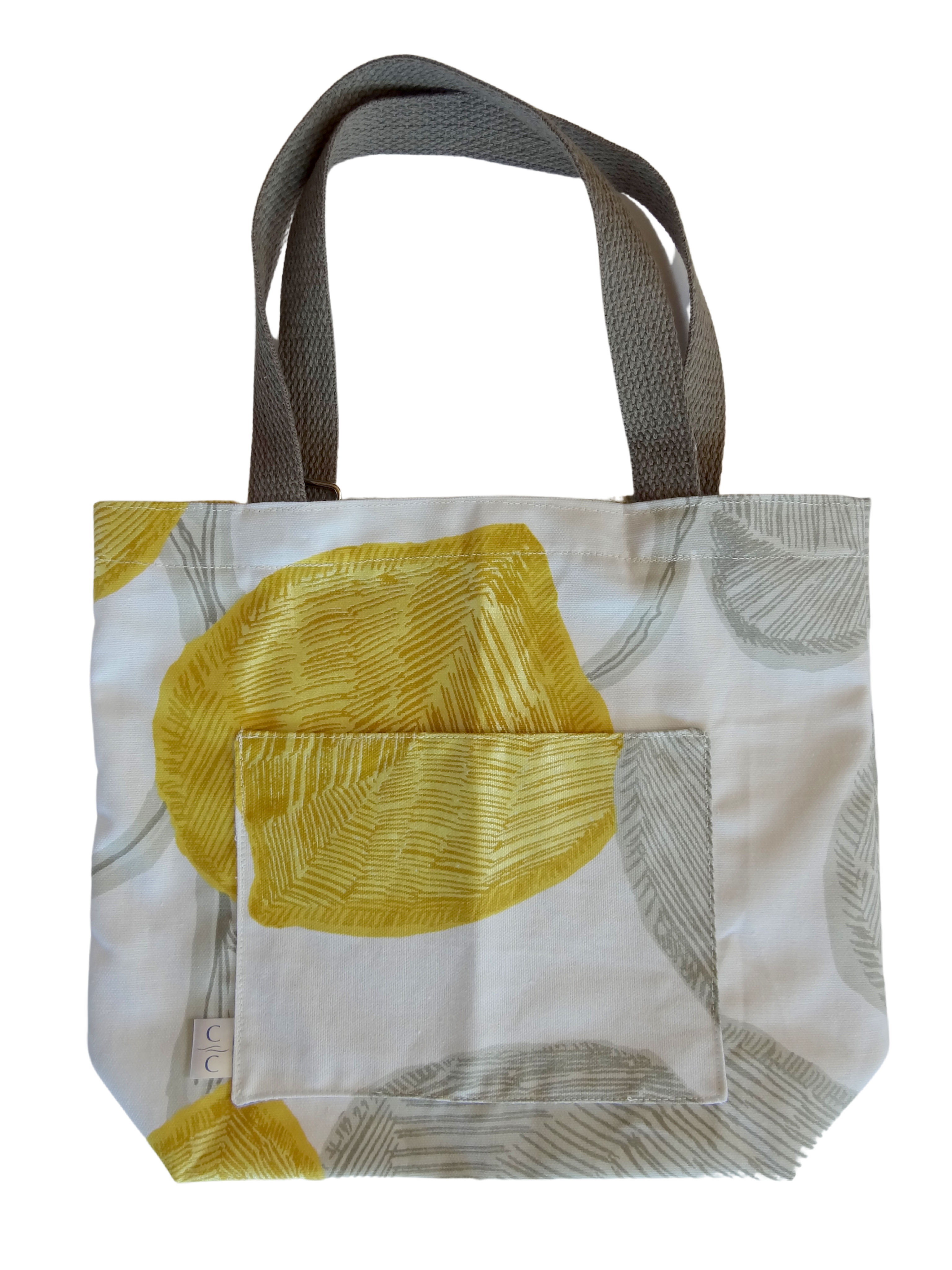 Each market bag is unique and individually made with new, upcycled, high-fashion material. Beautifully designed and sturdy, perfect for books, flowers, gifts, iPad, day planner, and more! Pocket adds more storage for your phone, book, wallet, sanitizer, etc. The tote includes a ring on the interior, great for attaching your keys or coin purse.